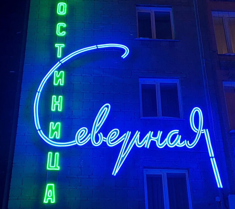 Речь идёт о вывеске 1961 года (!) — "Северное сияние", расположенной на фасаде гостиницы "Северная". За 60 лет она неоднократно модернизировалась, последний раз — в 2005 году. Но к 2024 году постоянные поломки (высота 10–20 метров, погасшие буквы, сосульки) сделали эксплуатацию невозможной.